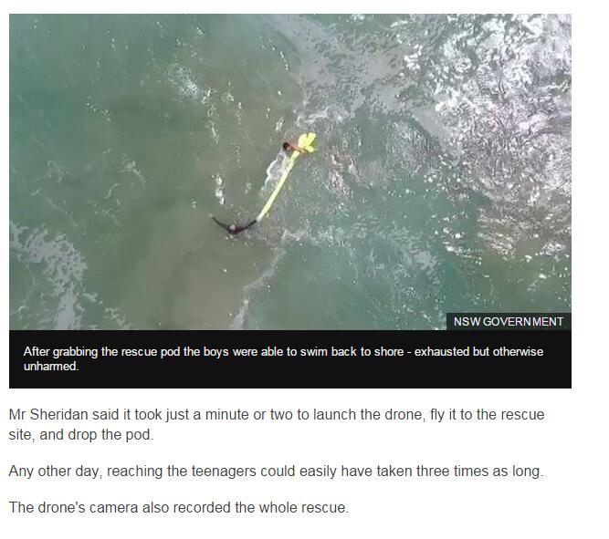 報道中稱,兩個小男孩被發現在新南威爾士州的雷諾克斯角海岸附近的海水中掙扎。這兩個男孩被10英尺高的海浪困住,而且船只無法靠近他們,但是最終一架無人機起飛并且為他們送去了一個充氣式救生裝置,讓他們得以獲救。