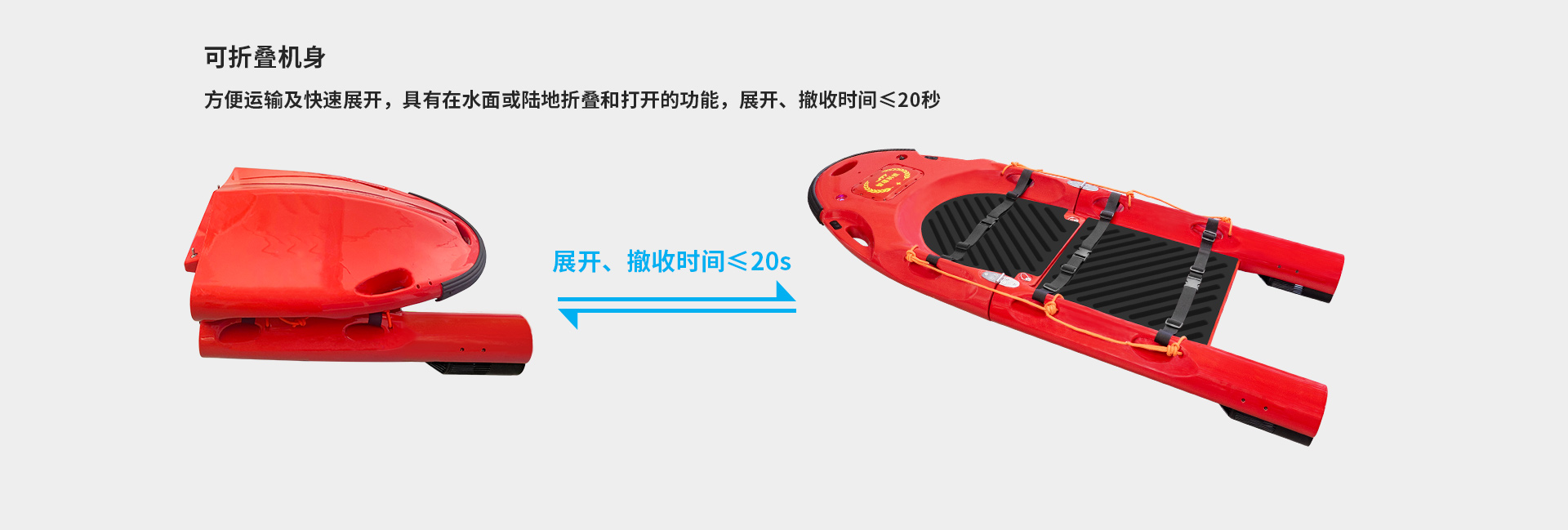 可折疊機身:方便運輸及快速展開,具有在水面或陸地折疊和打開的功能,展開、撤收時間≤20秒;